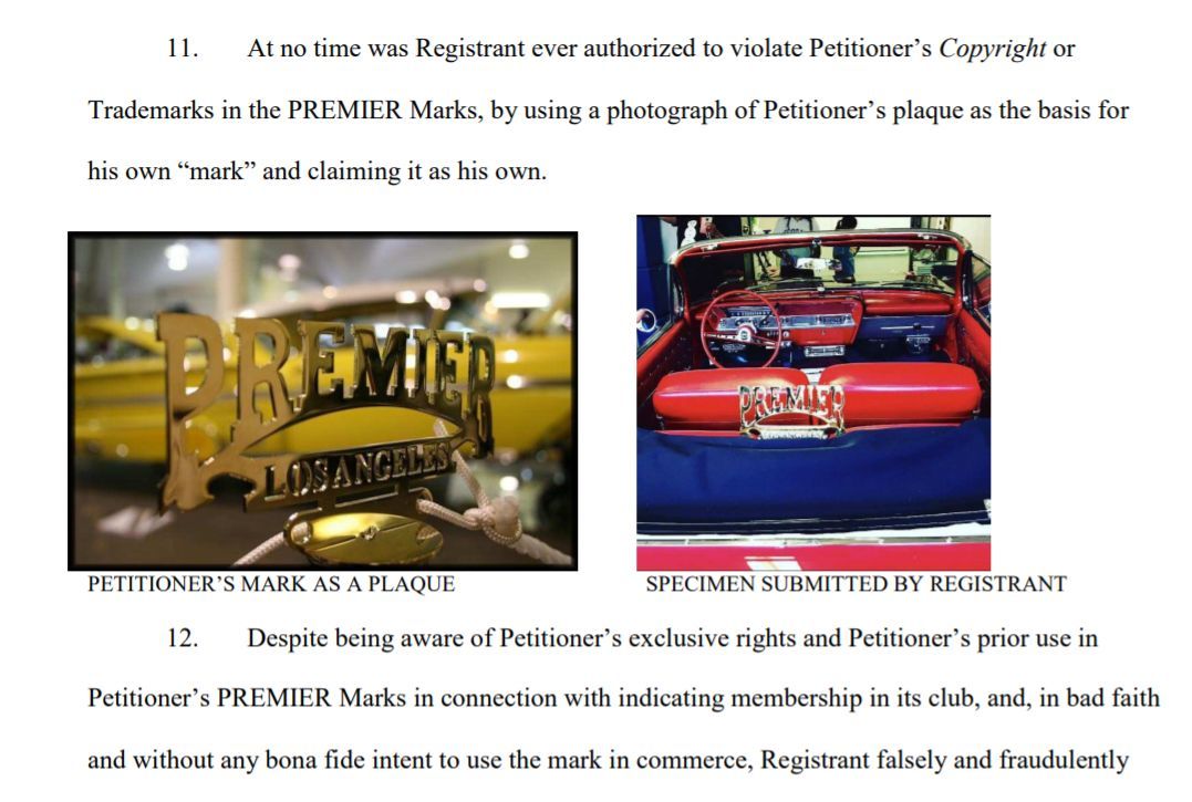 Premier Car Club Los Angeles v.Chris Fields - 取消編號92070761申請取消相同商標PREMIERE LOS ANGELES(由前心懷不滿的俱樂部會員不正式註冊)註冊的葡萄酒熱棒汽車俱樂部廣泛使用的商標2001年商標委員會基於以下幾個理由維持了這一點: - 優先權和混淆可能性商標法第14(1)和2(d)條 - 商標中不使用商標法第14(1)和1(a)條, (c),和(d) - 註冊人不是已識別商品或服務商標的合法所有者商標法第14(1)和1)條 - 虛假陳述商品或服務的來源;和商標法第14(3)條 - 欺詐美國專利商標局。商標法第14(3)條;在Bose公司,